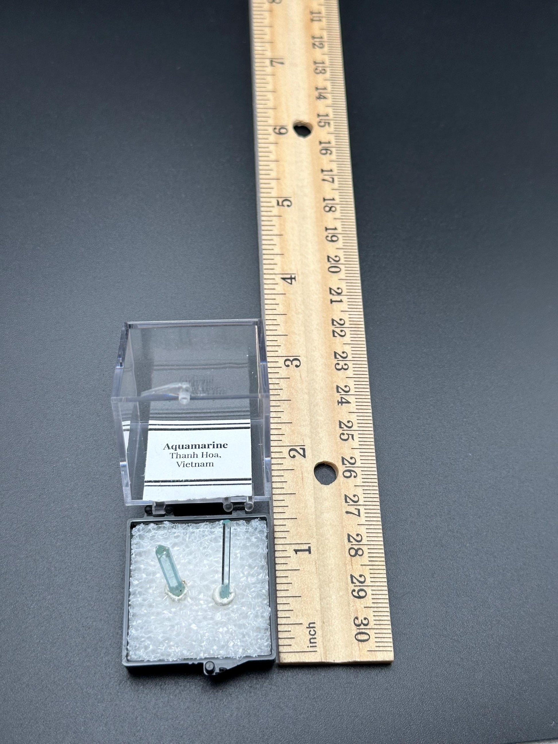 One of the Aquamarine crystals is approximately 3.4mm x 16.2mm x 3mm and 0.29g and the other is approximately 2.1mm x 19.3mm x 1.6mm and 0.14g.