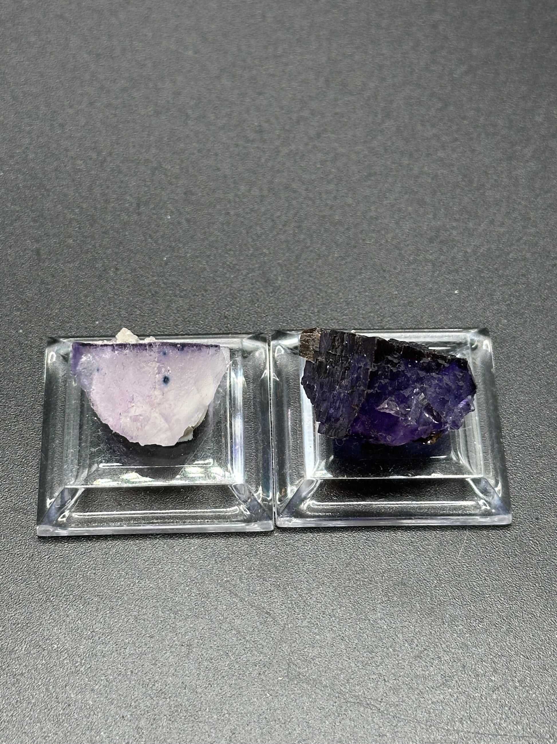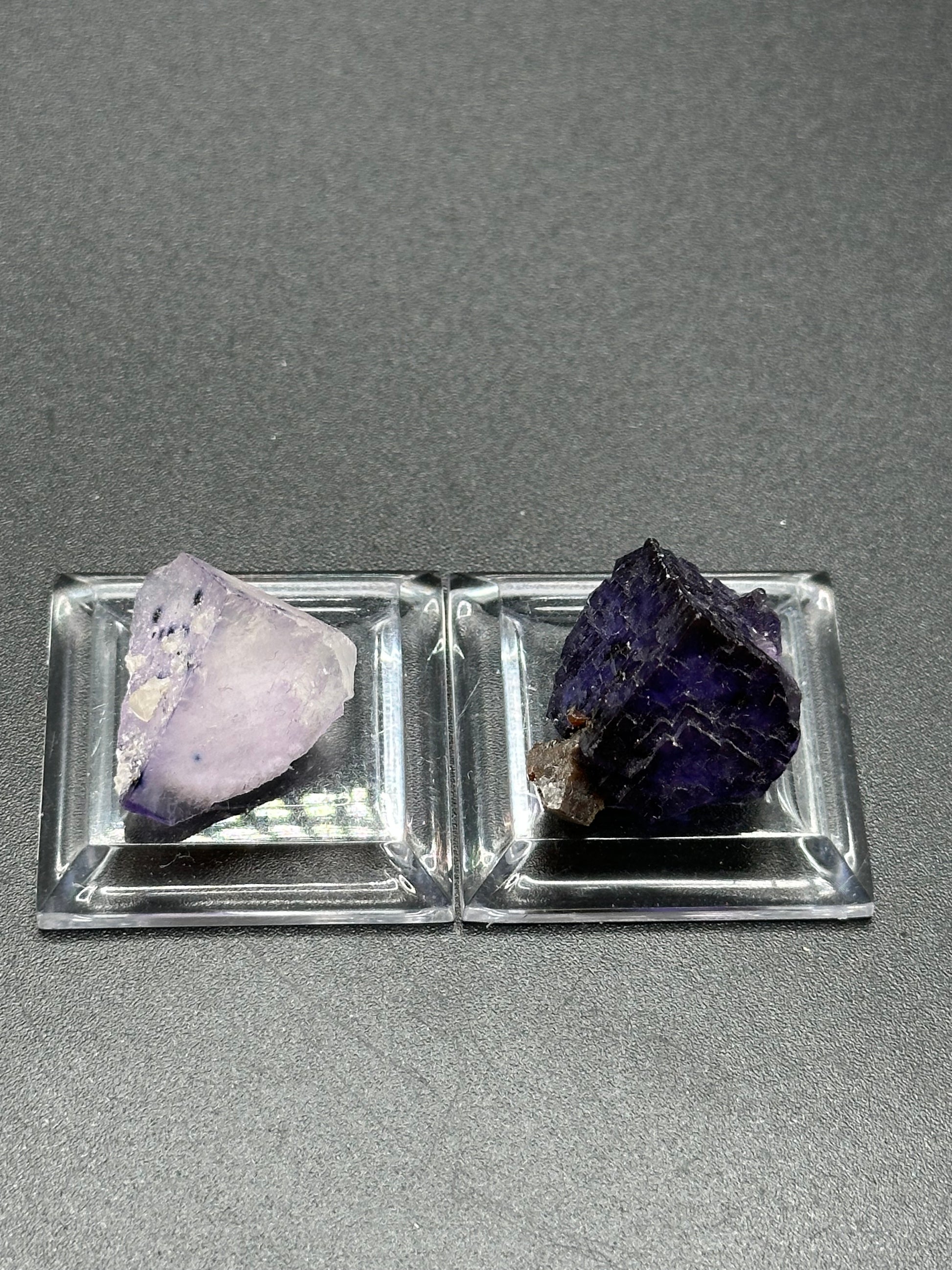 The light purple fluorite is 20.6mmx11.8mmx16.9mm, 3.82g. The dark purple fluorite is 24.5mmx14.4mmx18.9mm 6.08g.