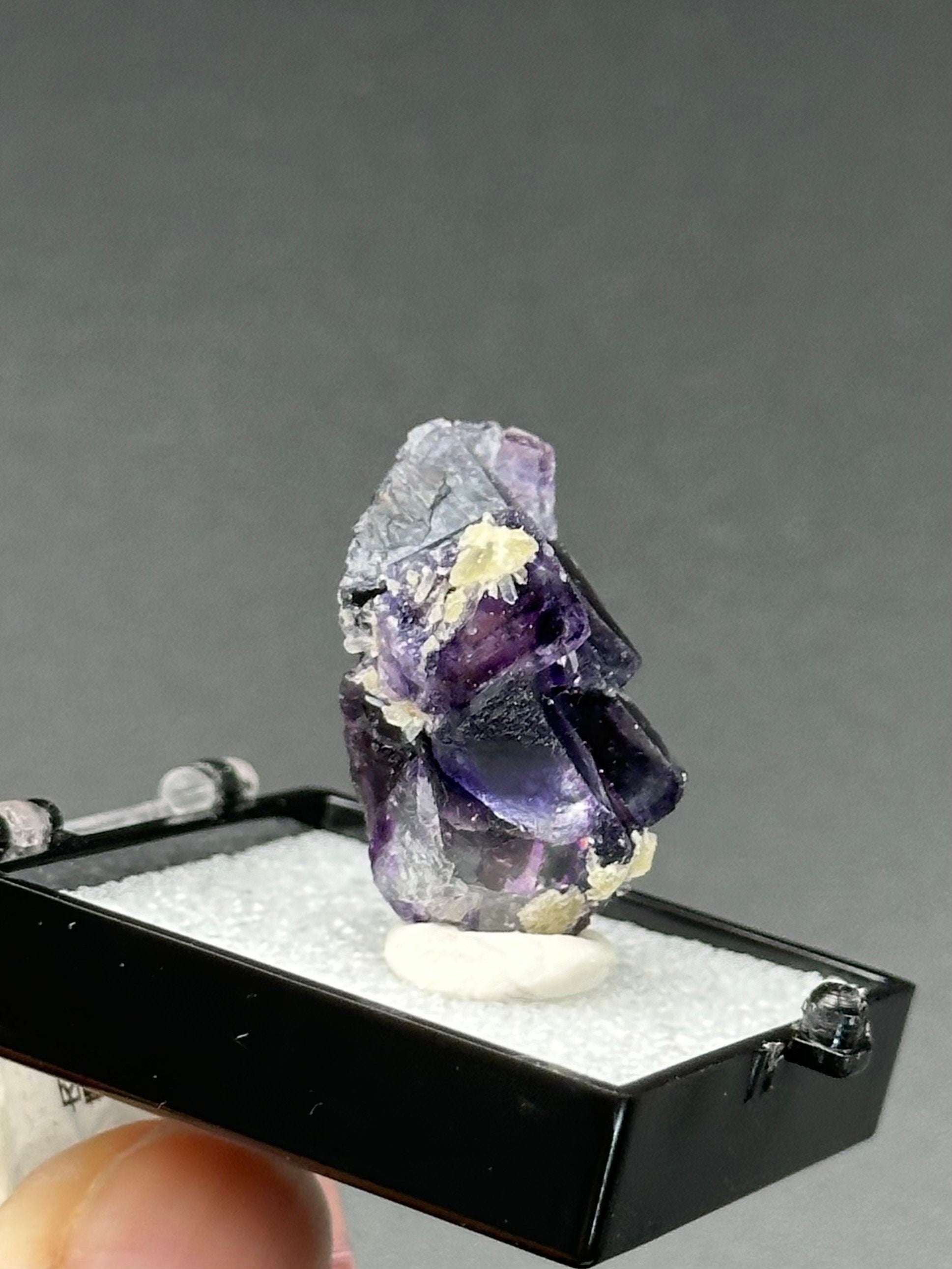 Beautiful Yindu Fluorite Specimen in a perky box from the Yindu Mine, Inner Mongolia, China. 12.8mmx26.1mmx11.8mm, 6.39g