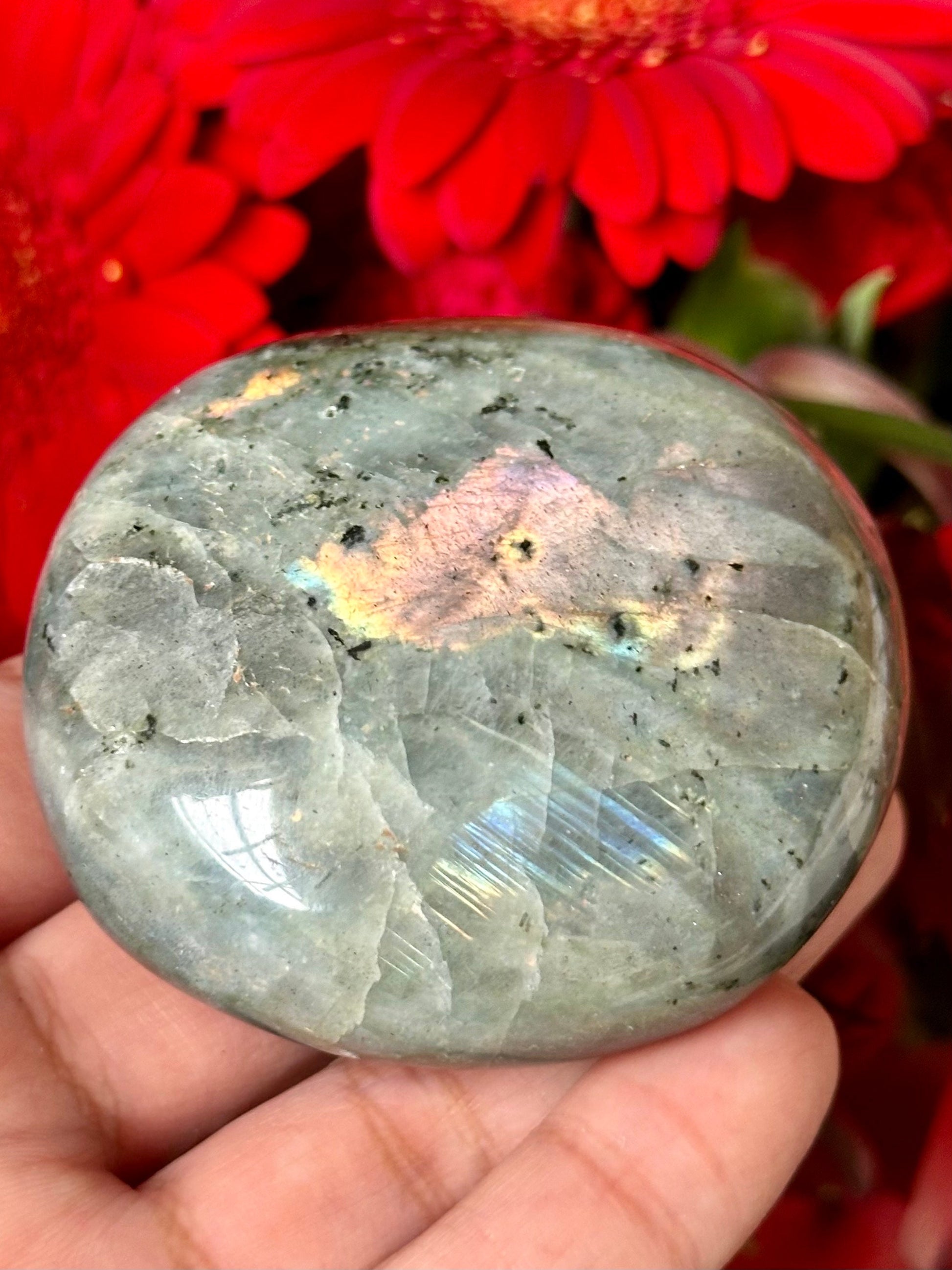 Gorgeous Labradorite Palm Stone from Madagascar. 2.42"x1.18"x2.23", 5.6 oz