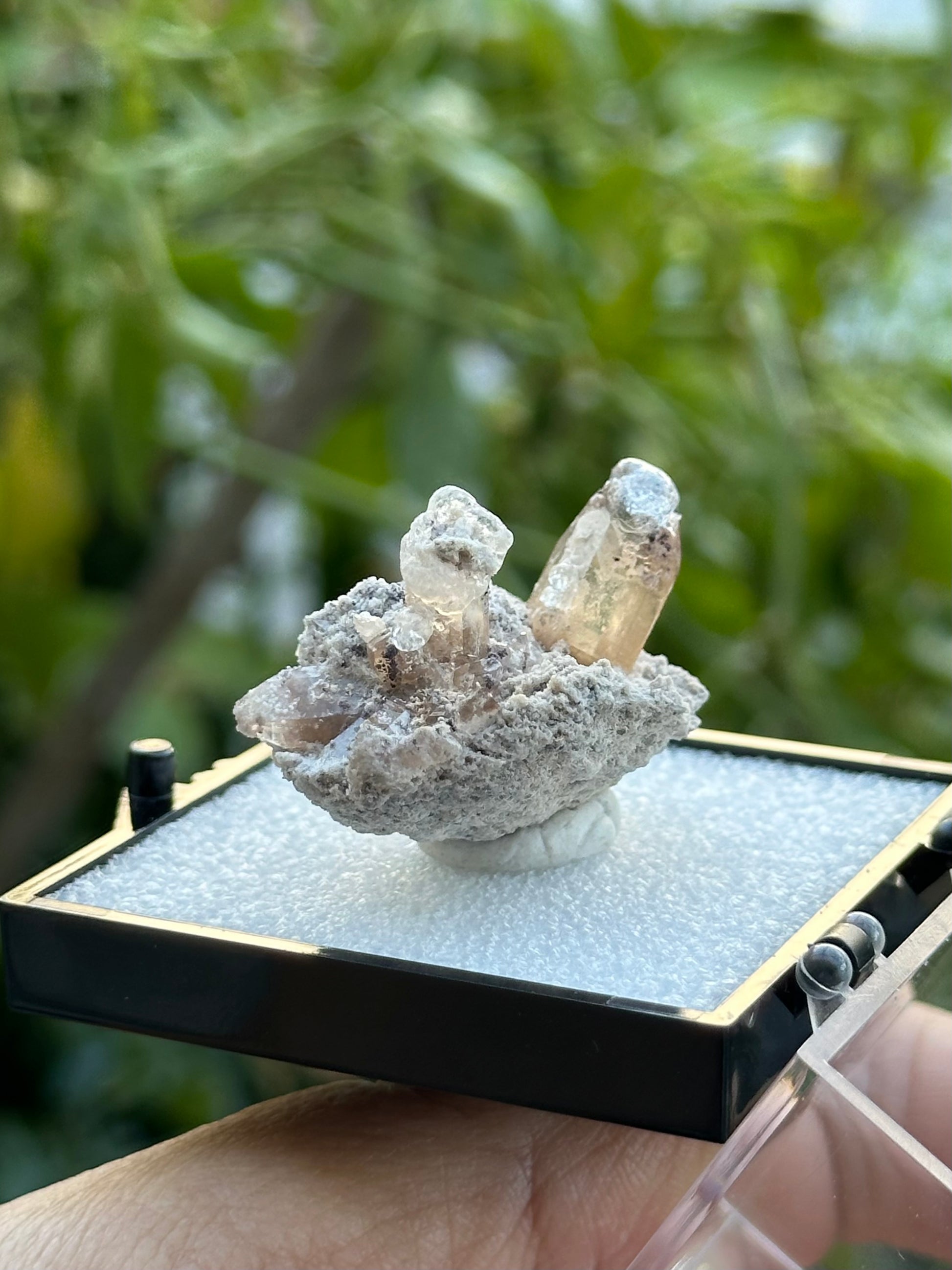 Beautiful Hyalite Opal on Topaz from San Luis Potosi, Mexico in a perky box. UV Reactive.