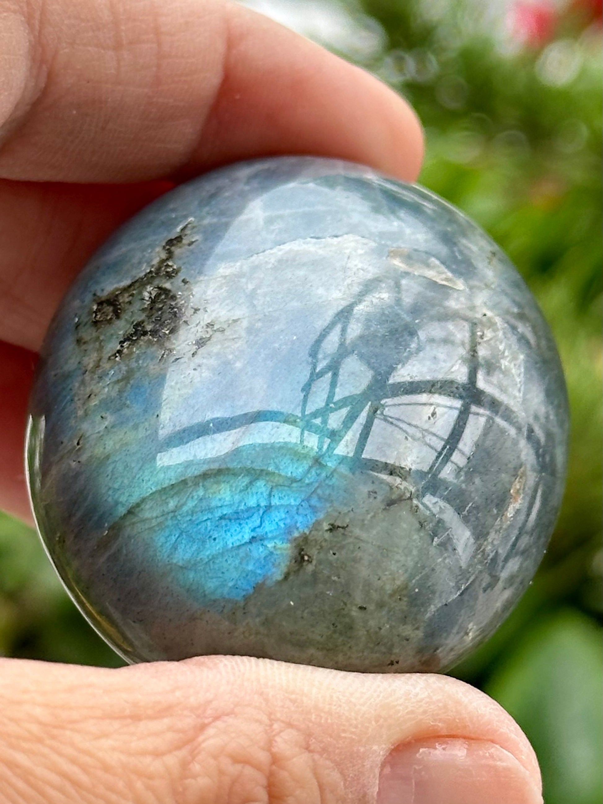 Lovely Labradorite Palm Stone from Madagascar. 2.13"x1.07"x1.66", 3.1oz.