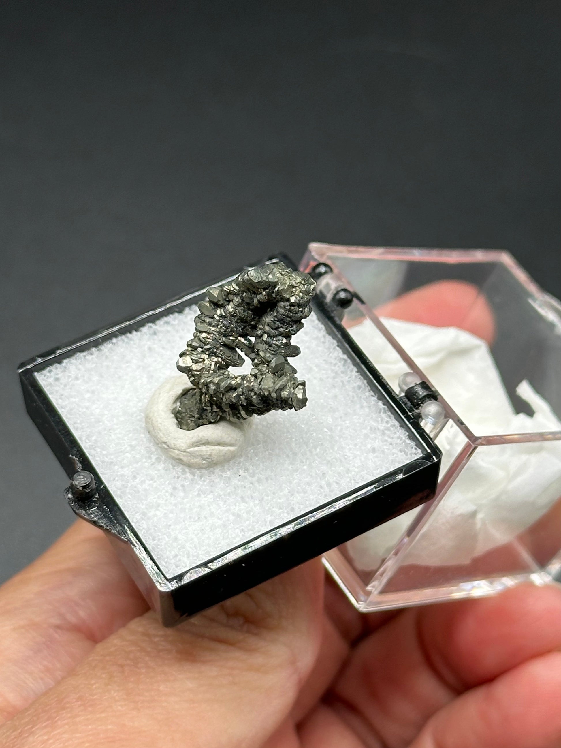 Marcasite Specimen in a perky box from the Linwood Mine, Buffalo, Scott County, Iowa.