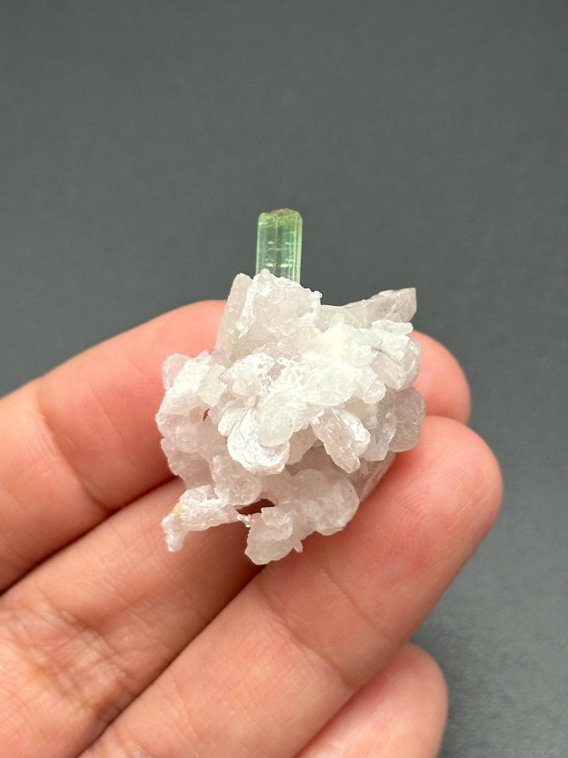 Stunning Small Green Tourmaline on Quartz with Lepidolite Specimen from Paprok, Afghanistan.