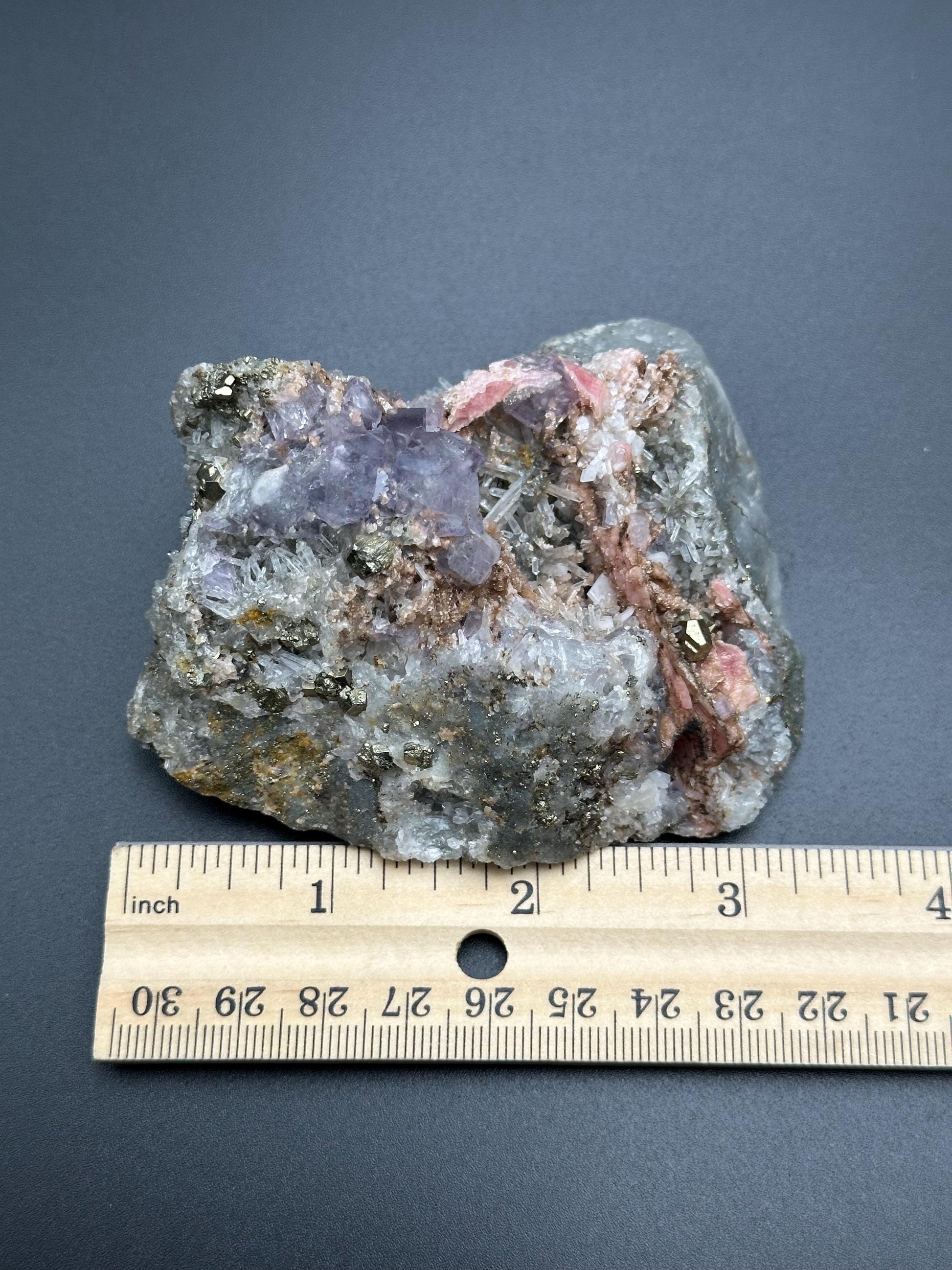 Stunning Rhodochrosite with Pyrite, Quartz, and Fluorite on from the Wutong Mine, Guangxi, China. UV Reactive.
