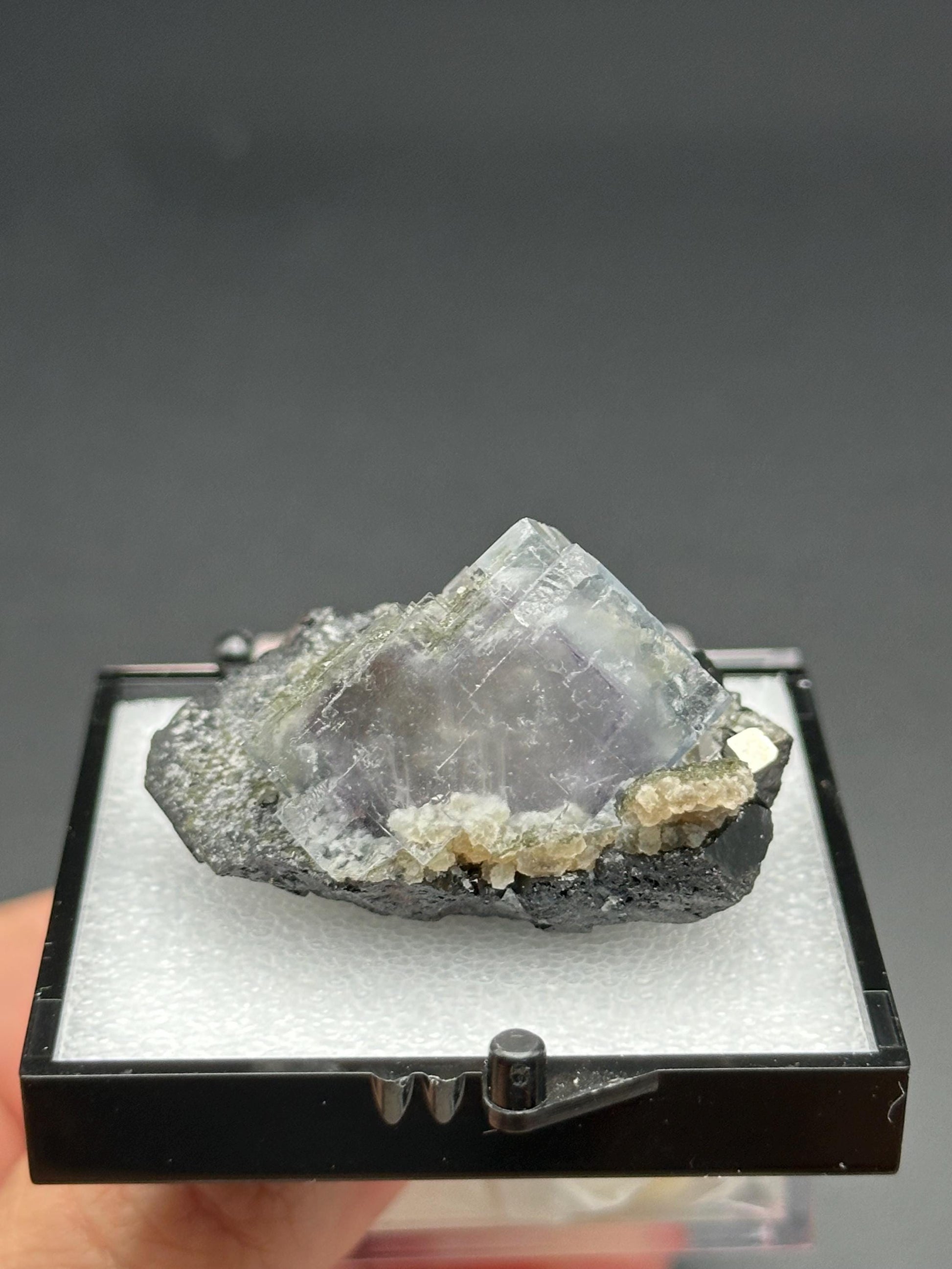 Stunning Wolframite Fluorite Specimen, in a perky box, from the Yaogangxian (YGX) Mine, Hunan, China. 1.63"x1.01"x1.35", 2.2oz.
