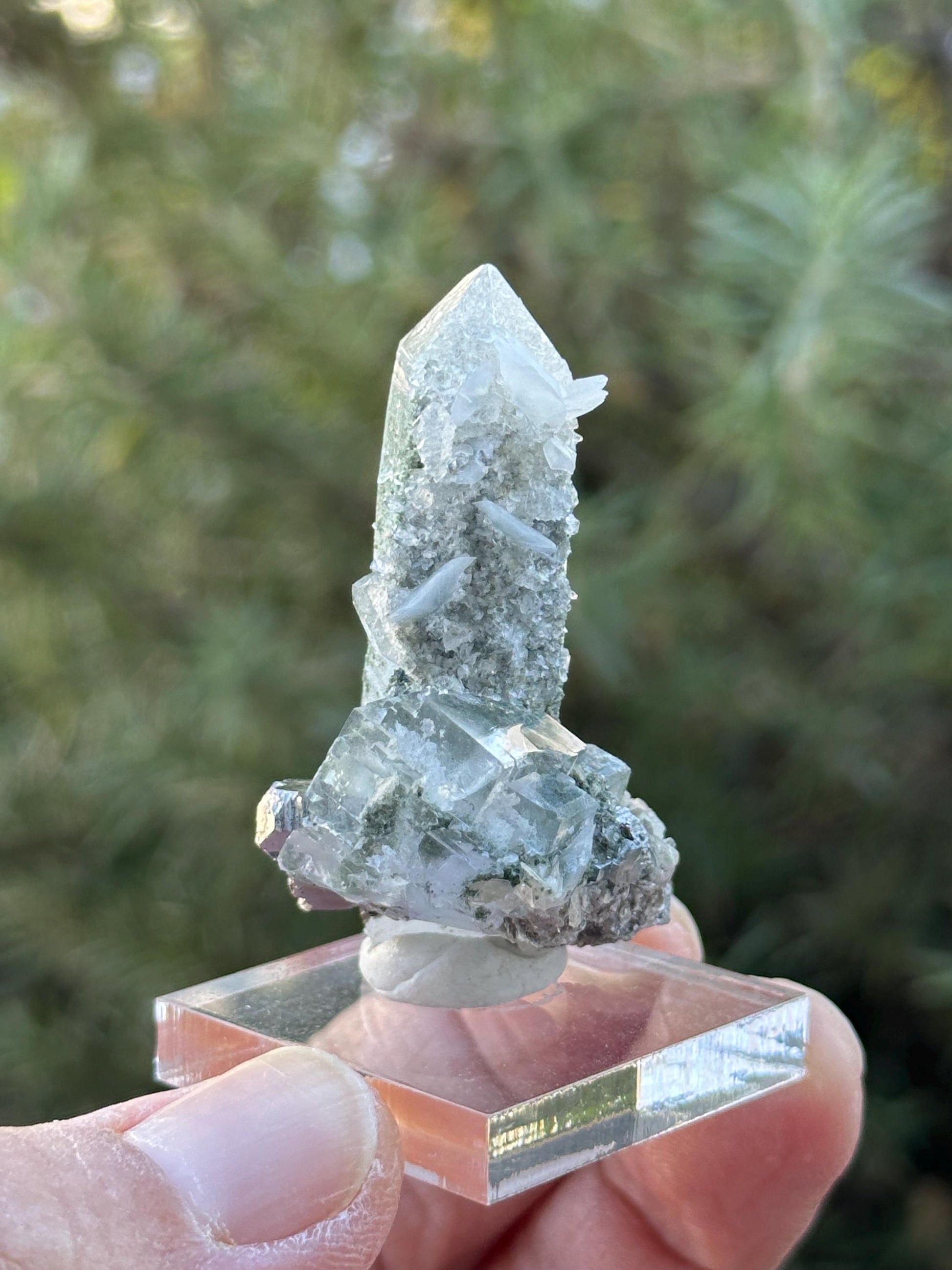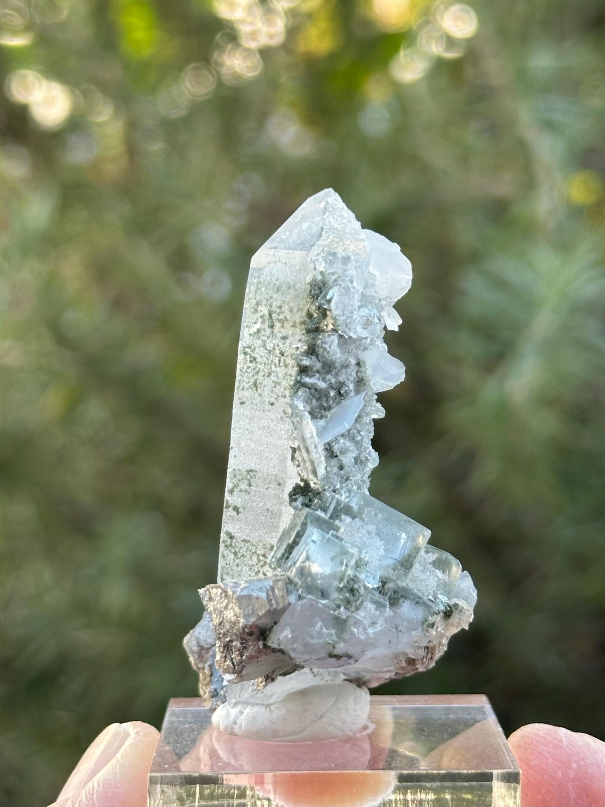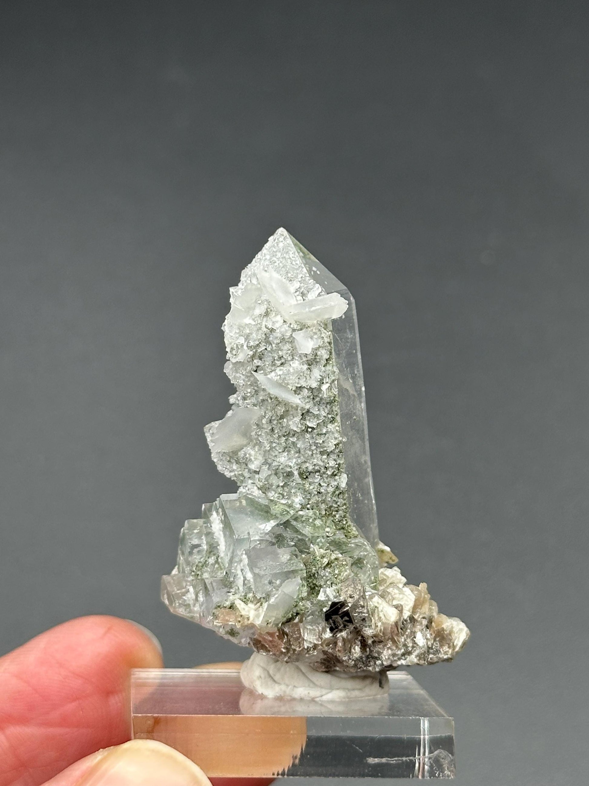 Stunning YGX Quartz with Pyrite, Fluorite, and Calcite Specimen on a stand from the Yaogangxian Mine, Hunan, China.