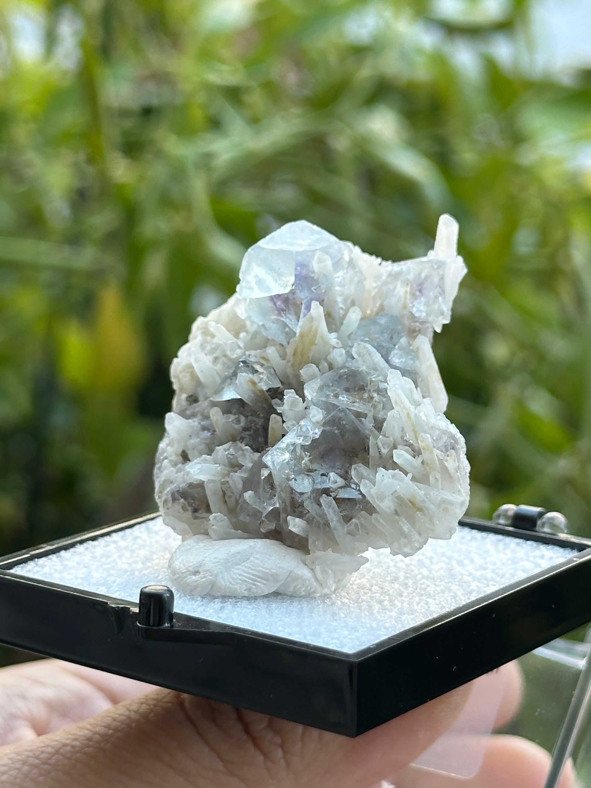 Stunning Yindu Flourite with Quartz Specimen in a perky box from the Yindu Mine, Inner Mongolia, China. UV Reactive.